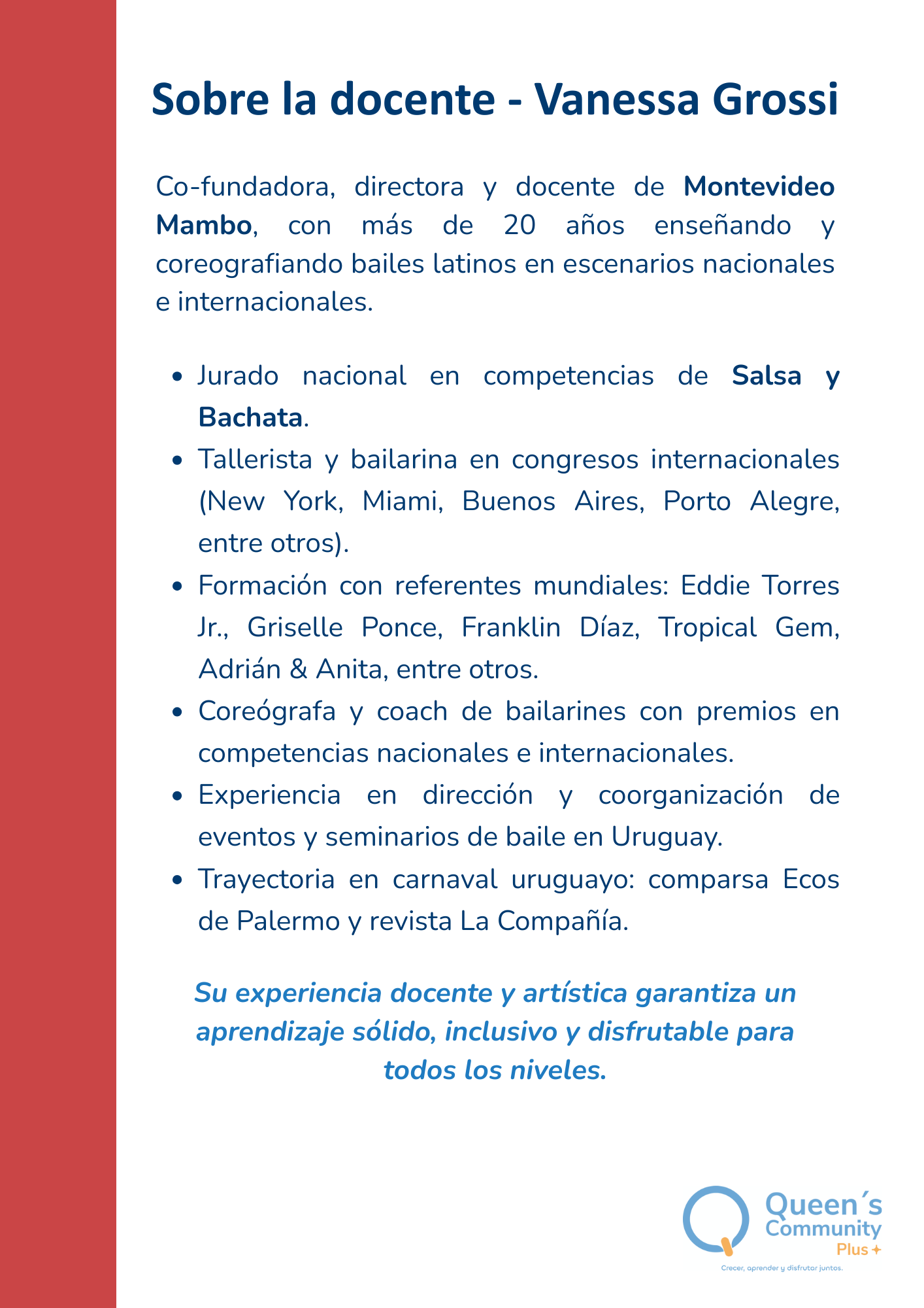 Descripción: Con Vanessa Grossi, descubrí el placer de bailar y conectarte en un ambiente cálido y divertido, sin importar tu experiencia.