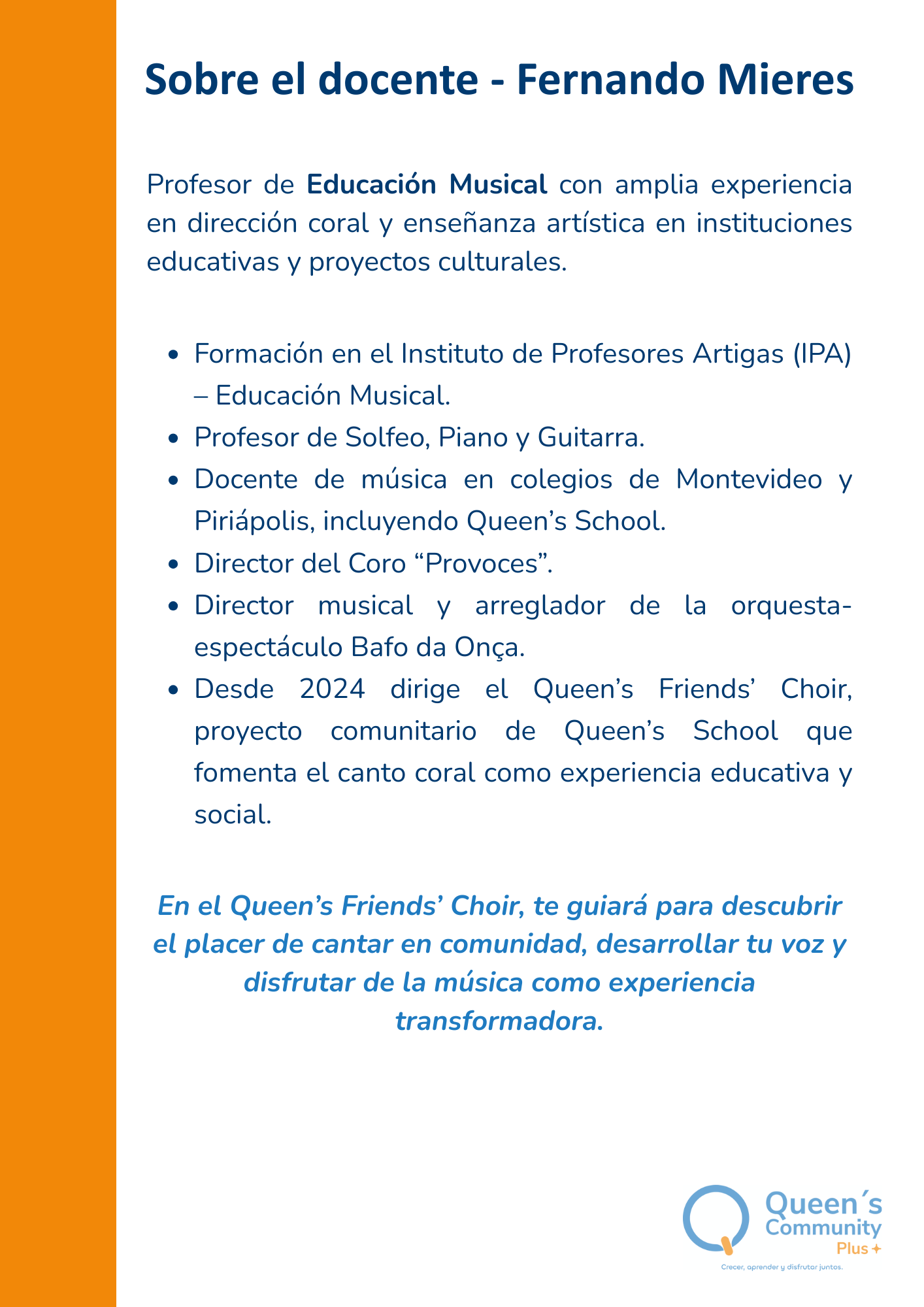 Descripción: Bajo la dirección de Fernando Mieres, el coro reúne voces de la comunidad para celebrar música y amistad.