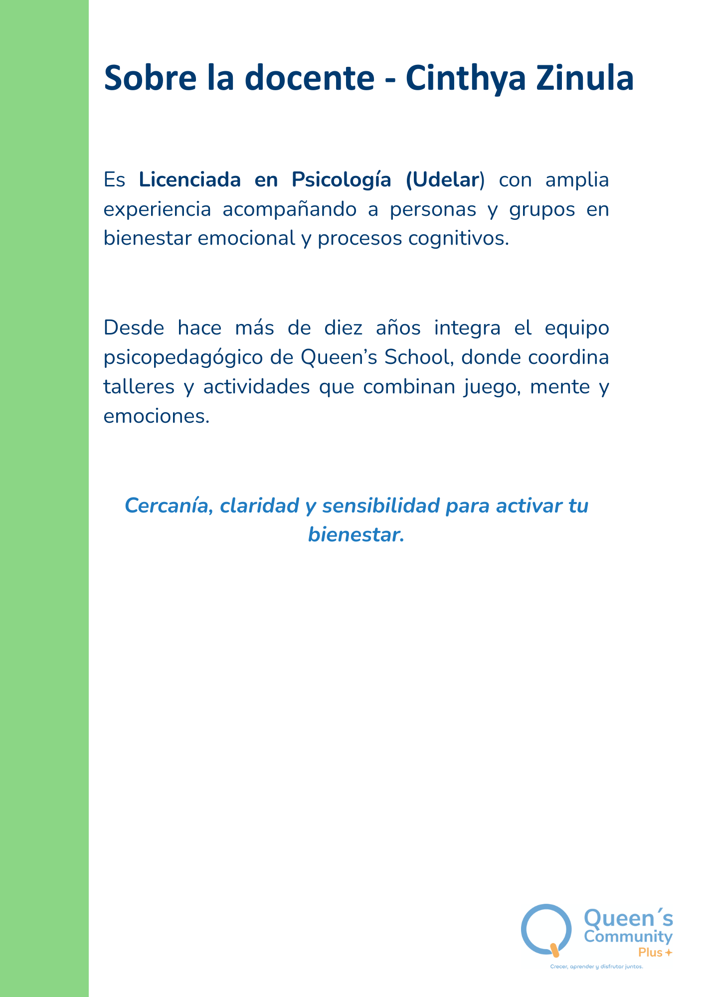 Descripción: Activá tu mente y tus emociones en un espacio cercano, lúdico y pensado para tu bienestar.